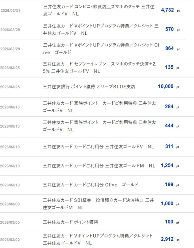 | 2026/03/25 | 三井住友銀行 ポイント獲得(オリーブBLUE支店) | 10,000 pt |